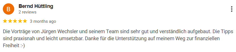Jedes Webinar mit Jürgen Wechsler bringt absoluten Mehrwert. Durch sein umfangreiches Wissen habe ich schon sehr viel lernen können und wertvolle Hinweise erhalten. Dafür bin ich sehr dankbar.