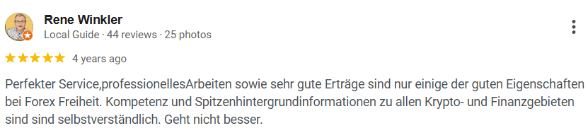 Ich habe bisher die Kurse Krypto - Trading Akademie und die Forex - Trading Akademie erworben. Diese Kurse sind nicht nur sehr lehrreich, sondern bieten einem das Grundwissen für das Trading in diesen Bereichen. Demnächst werde ich diese Kurse mit den zur Verfügung stehenden Erweiterungen vervollständigen. Man fühlt sich einfach gut aufgehoben bei der Forex Freiheit GmbH. Fragen werden umgehend beantortet, die umfangreichen Webinare bieten eine weitere Grundlage, eigenes Wissen immer weiter auszubauen. Eine ständige Unterstützung ist auch durch die Tradingsignale innerhalb der Kurse gegeben. Der Erwerb der Kurse ist gut investiertes Geld und ich kann sie nur empfehlen!
