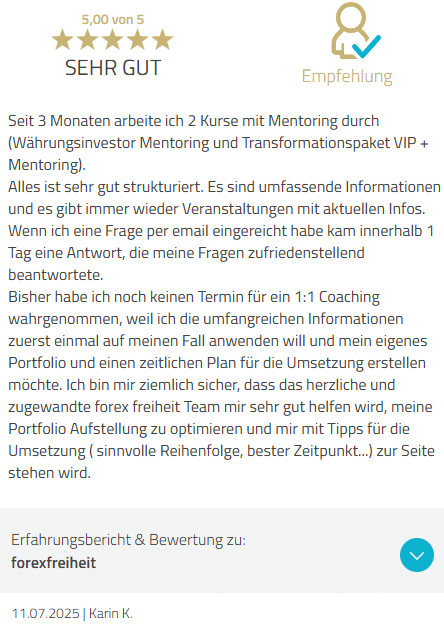 Das Unternehmen ist absolut seriös. Ich habe mit den Ausbildungen ob live oder online durchweg positive Erfahrungen gemacht. Das Team funktioniert, Integrität ist ein Wert des Unternehmens, der ganz vorn ansteht und der Kundenservice wird seinem Namen mehr als gerecht- er ist die Perle. Das unkomplizierte persönliche Weiterhelfen bei Unklarheiten setzt Maßstäbe und ist ein wesentlicher Faktor für das Vertrauen, das sich kontinuierlich in Forex Freiheit entwickelt.