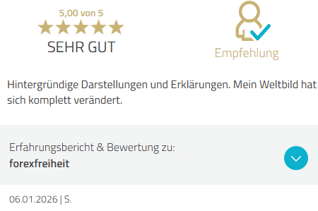 Für mich als Laie war dies der volle Glücksgriff: komplexe Zusammenhänge einfach und verständlich erklärt, durch die Video-Lektionen im Mitgliederbereich immer wieder abrufbar, Webinare mit aktuellen Informationen, kompetenter und sehr freundlicher Support - eine runde Sache. Bin begeistert und kann Forex Freiheit guten Gewissens weiter empfehlen. Vielen Dank und weiter so!