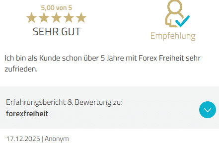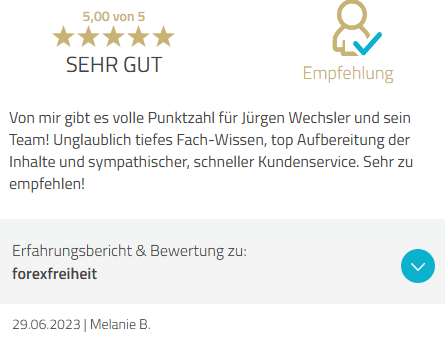 Die Forex Freiheit GmbH bleibt Deine verlässliche Basis – rechtlich und organisatorisch ändert sich nichts. Die Bewertungen auf dieser Seite spiegeln die extrem hohe Zufriedenheit unserer Kunden mit ForexFreiheit/GeldMehrWert wider.